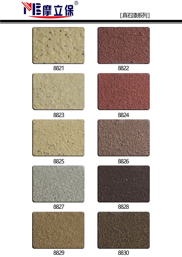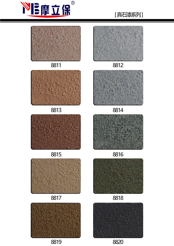 摩立保真石漆以高耐候有機(jī)硅改性丙烯酸乳液和天然彩砂為主要原料精制而成,具有天然真實(shí)的自然色澤,給人以高雅、和諧、莊重之美感。適合于各類建筑物的室內(nèi)外裝,特別是在曲面建筑物上裝飾,可以做到生動(dòng)逼真,回歸自然的功效。
